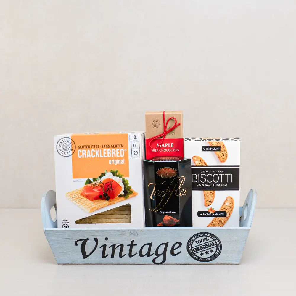 Tray – This gift basket is beautifully presented in a light teal vintage wooden tray, adding rustic charm and a soft pop of color to elevate its overall presentation.
