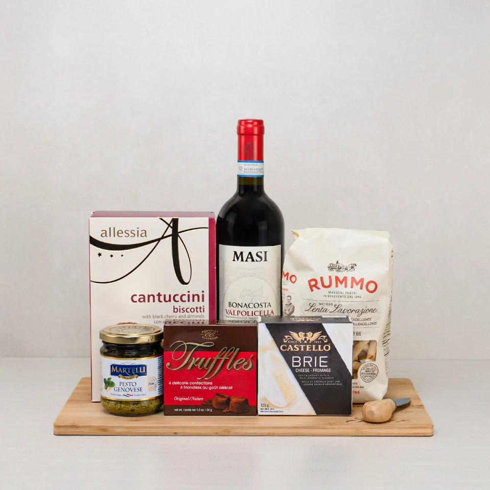 • The Holiday Harmony Wine & Treats is made for moments that feel a little warmer at Christmas. A glass of Valpolicella by the tree, truffles that melt too quickly, and cantuccini with that unforgettable crunch. Brie, pesto, pasta, simple flavors that turn a quiet night into something special. It’s a basket you send to family, share with a friend, or gift to a client when words aren’t enough. You can add more products with the option to add champagne or more sweets to make it yours.