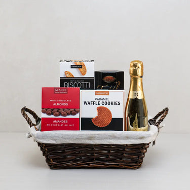 • Bottle of Sparkling Wine (200ml) - This gift basket includes a mini bottle of sparkling wine. You can also upgrade to select any other bottle of your choice.
