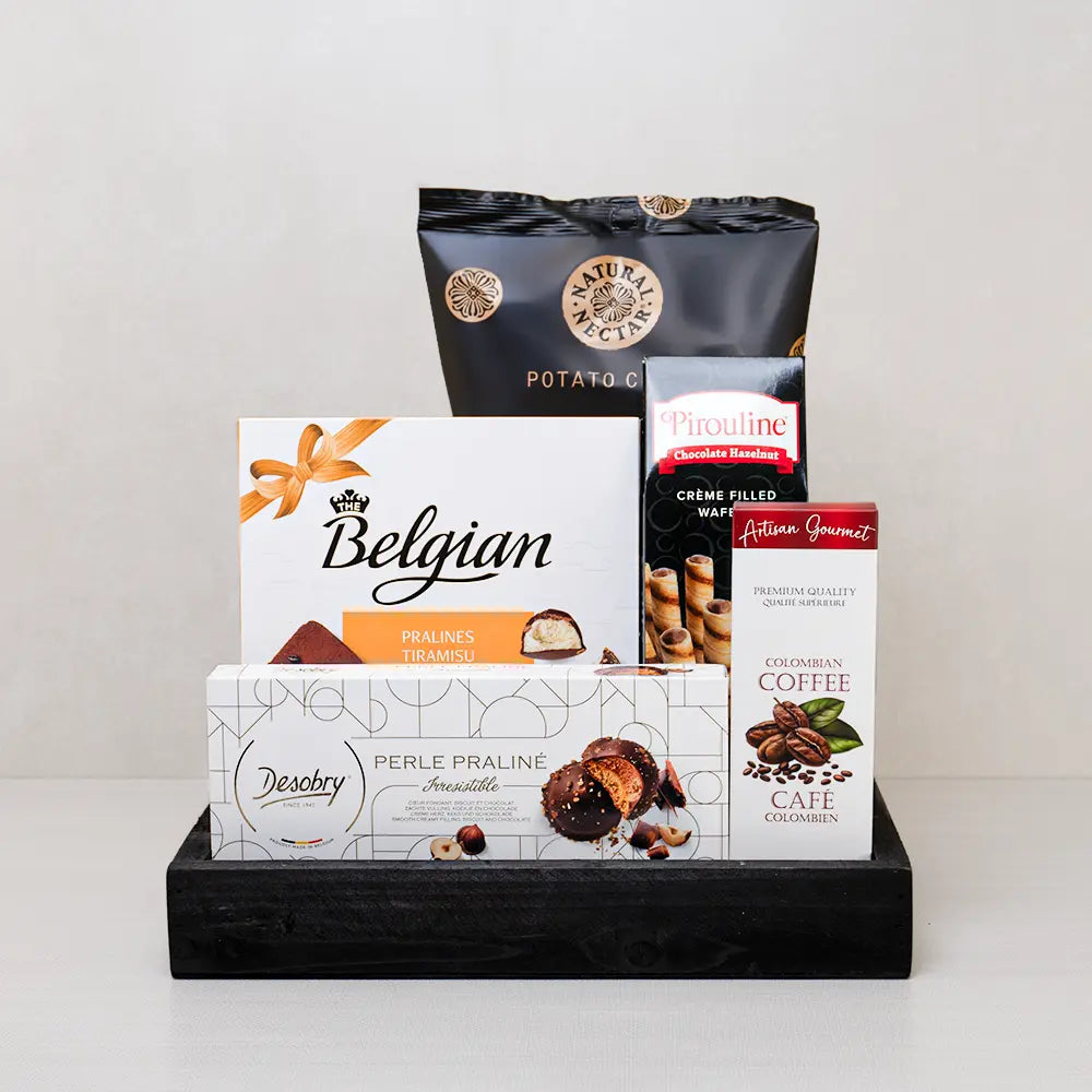 Assorted Chocolates – Indulge in a selection of luxurious pralines crafted with the finest ingredients for an unforgettable taste experience. These rich tiramisu-flavored chocolates come in elegant packaging, making them the perfect addition to any gift basket and elevating your gift to a whole new level of indulgence.