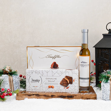 Celebrate the season's magic with Midnight Around the Tree. This luxurious basket is perfect for snuggling around the evening fire. You receive a bottle of ice wine, buttery cookies with Belgian milk chocolate, caramel fudge with sea salt. The cocoa truffles are individually wrapped and coated with rich cocoa powder. They are almost to melt in you mouth. If ever there is an indulgent treat that will make you want to wrap yourself in a blanket, this dessert is it.