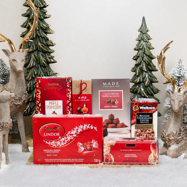 Celebrate the sweetness of the season with Season's Sweetest Basket. This collection mixes classic treats with real Canadian flavors. You get smooth Lindor chocolates with creamy centers, rich cocoa truffles, and milk chocolate maple truffles packed with maple goodness. The sweet maple popcorn? That's the Canadian touch everyone loves. We've added buttery biscuits with Belgian chocolate chunks and crisp water crackers to round things out.