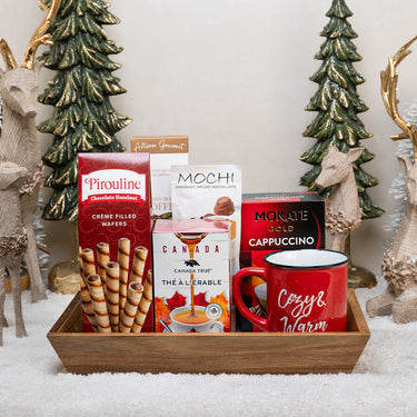 - The Snowy Morning Basket - Spread a little holiday cheer with the Snowy Morning Basket and a cup of warm drinks. Chocolate Hazelnut Wafer and maple tea, enjoy Mocha Latte, Cappuccino Mix, and Gourmet Golden Blend Coffee, then wash it all down with a mug, but... An ideal Christmas gift basket for your godparents, cousins, nieces and nephews, role models, book club cronies, neighbors, or the friendly barista! This wonderful basket brings forth the chocolate and warmth of the winter season, a basket filled with treats... Each bite or sip is a sweet "Merry Christmas" in its own right.
