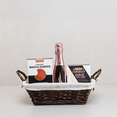 • The Sparkle & Savor is designed to add a little shine to the season. This gift basket includes a miniature bottle of sparkling wine (with the option to upgrade), creamy Danish brie, and caramel waffle cookies that bring sweet, buttery comfort to every bite. A thoughtful Christmas hamper for mom, a meaningful surprise for your wife, or a way to share joy with friends during holiday gatherings, it fits beautifully into the spirit of giving. You can also make it extra special by adding wine, champagne, or a selection of gourmet snacks from our custom options.