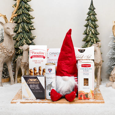 • The Jolly Gnome Basket isn’t just a gift. It’s a story wrapped in ribbon. You open it and suddenly the room feels a bit warmer. Inside the bottle of Ice Wine, a winter light glows with sweetness and calm that extends evenings. The soft and elegant creamy brie by its side is for snacking and nothing else. You’ve got a delicious maple fudge that will melt in your mouth long before you actually taste it and chocolate hazelnut wafers. The compromise of the friends with their cookies and crisp water crackers is sweet and savory at this family get-together. A small Santa gnome sits on top, naughty and vicious, watching the food. This is the basket you give to family, friends, or that one coworker who you think deserves a little magic this year. Add another bottle if you wish. Maybe more snacks. Make it your own. Just don’t wait too long, Christmas comes around quicker than you think.