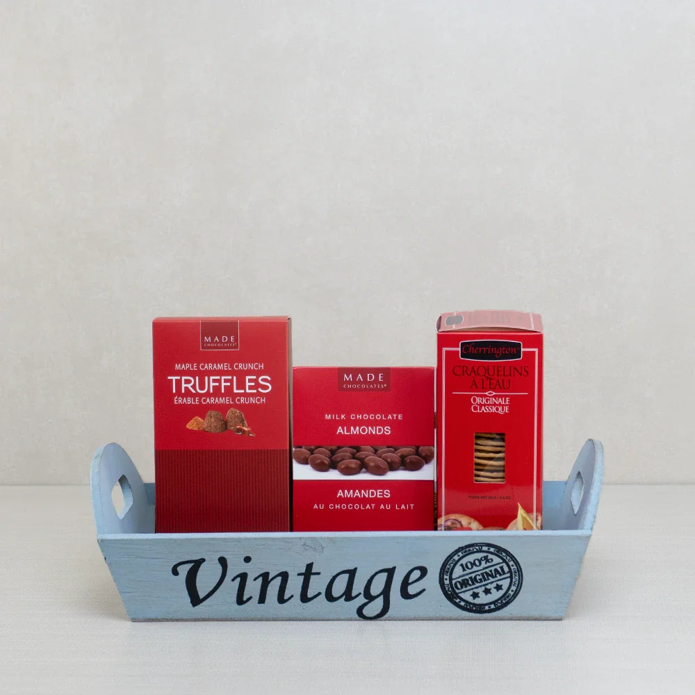 Tray – This gift basket is beautifully presented in a light teal vintage wooden tray, adding rustic charm and a soft pop of color to elevate its overall presentation.